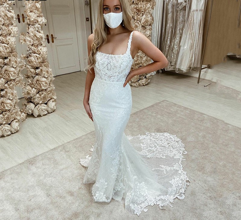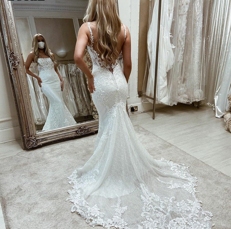 Spaghetti Straps Mermaid Wedding Dresses Boat Neck Lace Appliques Ivory Bridal Gowns