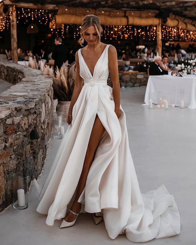 Vintage A-Line V Neck Satin Wedding Dresses