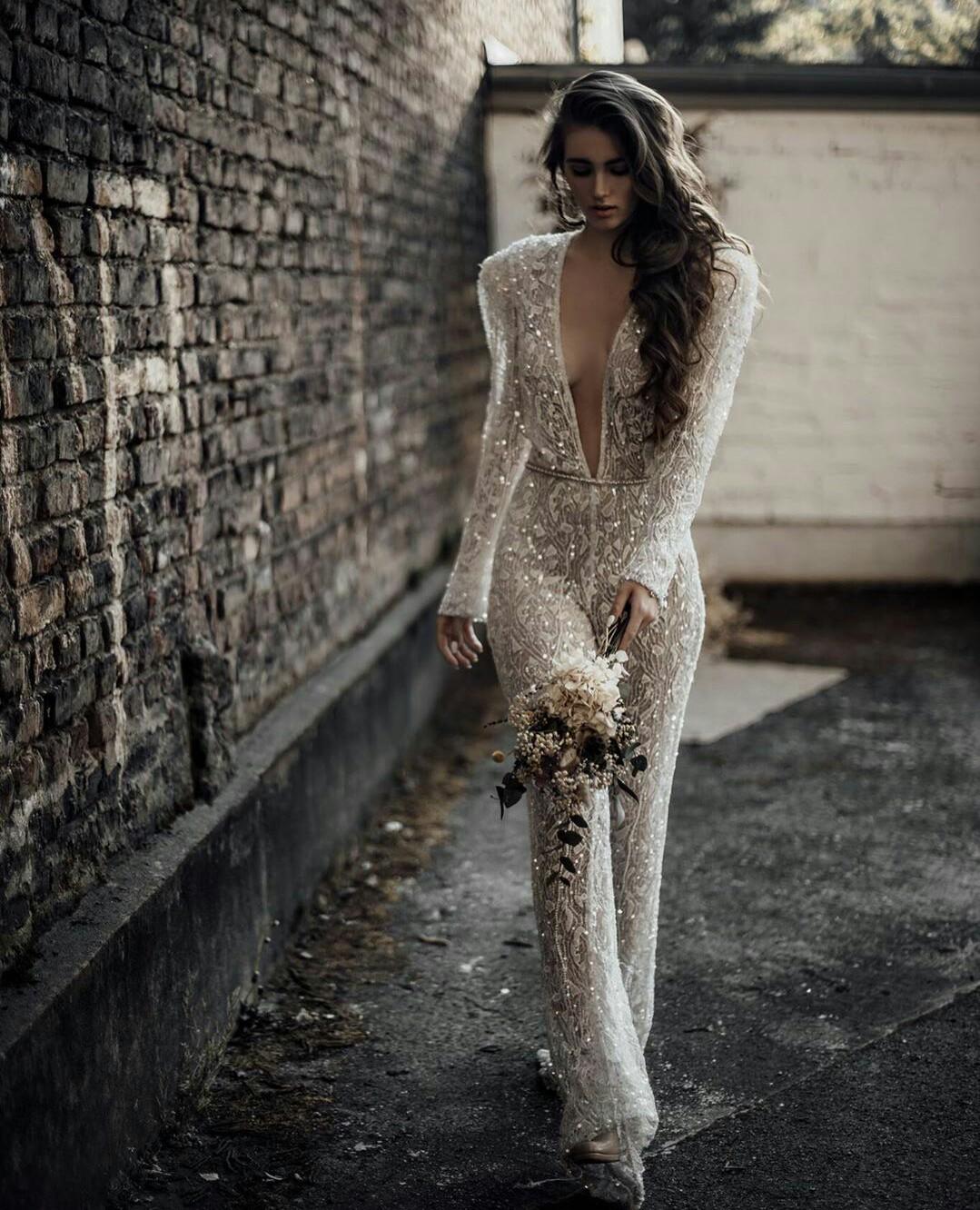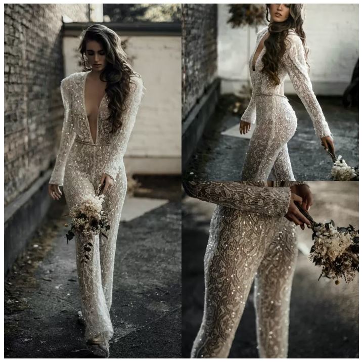 Bohemian Jumpsuits Wedding Dresses Lace Appliqued Deep V Neck Bridal Gown Beaded Crystal Boho Wedding Dress