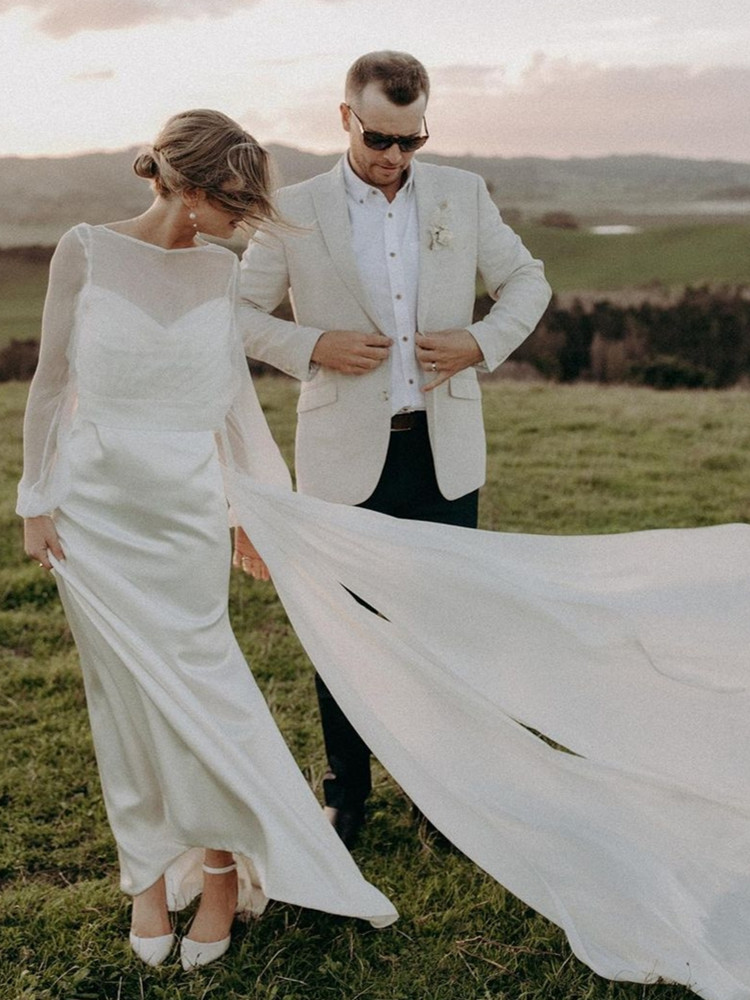 Elegant V-Neck Wedding Dress For Summer Puff Sleeves Backless Spaghetti Strap Court Train Bridal Gowns