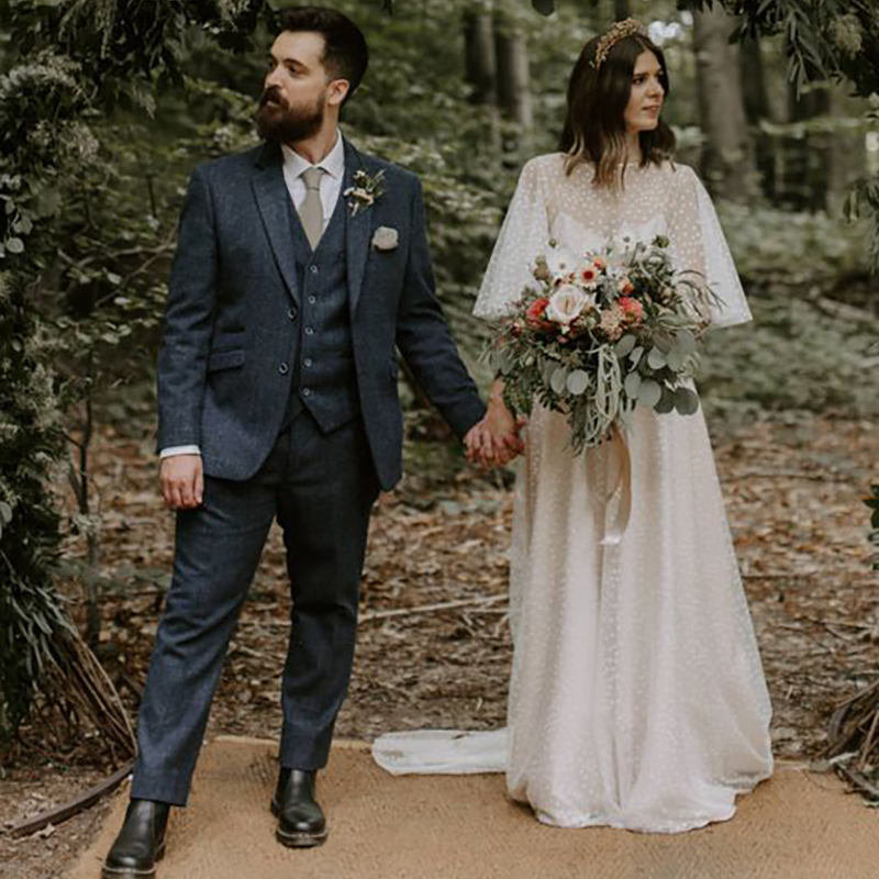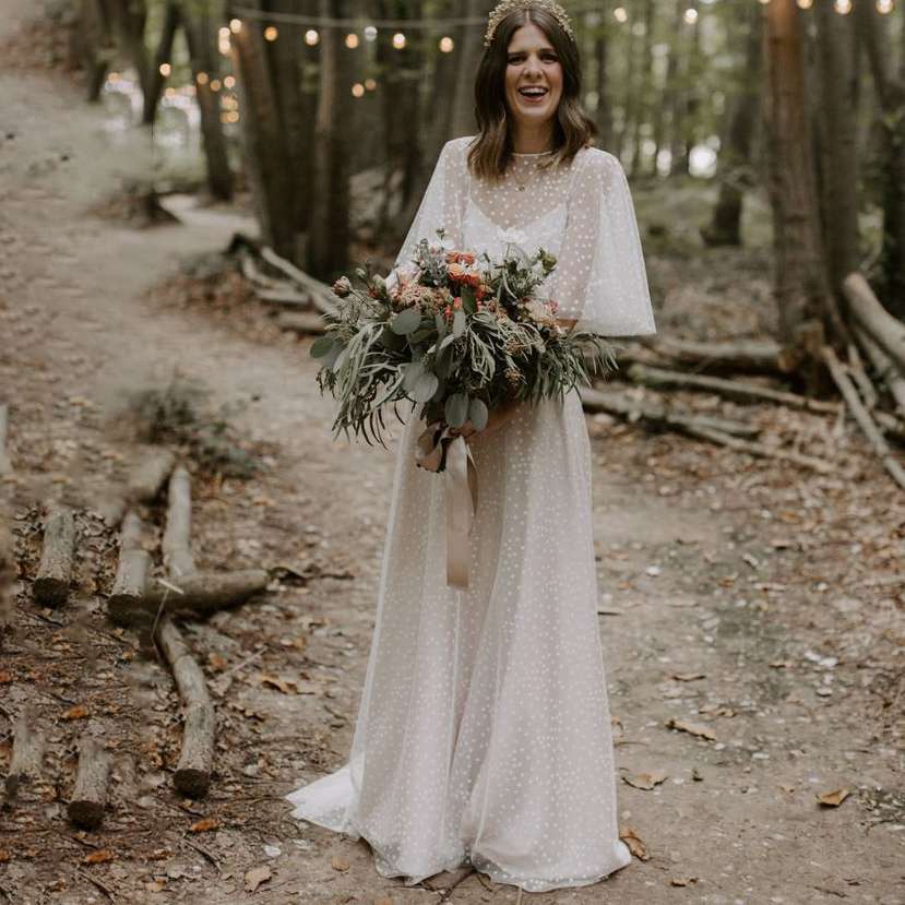 Half Sleeves Polka Dotted Tulle Bridal Gowns Bateau Neck Two Piece Open Back Simple Wedding Dress